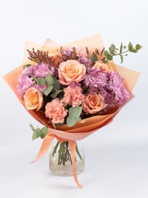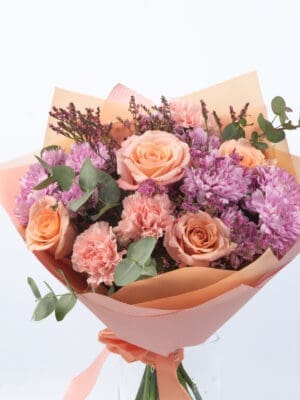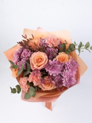 Bukiet z brzoskwiniową różą, eukaliptusem i goździkiem to elegancka kompozycja, która doda uroku każdemu wnętrzu. Doskonale sprawdzi się jako prezent na urodziny, rocznice czy inne wyjątkowe chwile. Wybierz ten bukiet, aby wprowadzić świeżość i kolor do swojego życia.