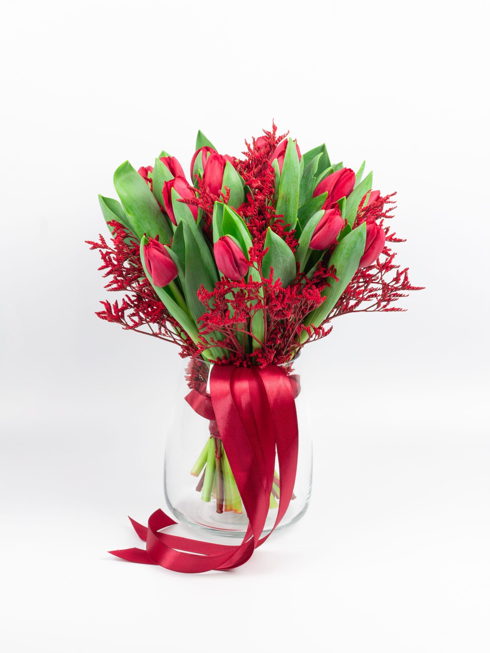 Bukiet z czerwonych tulipanów i czerwonego limonium to elegancka kompozycja, która doda uroku każdemu wnętrzu. Doskonały na romantyczne chwile, urodziny czy jako wyraz wdzięczności. Wykonany z najwyższej jakości kwiatów, ten bukiet z tulipanów zachwyci każdego miłośnika florystyki. Idealny do dekoracji lub jako prezent.